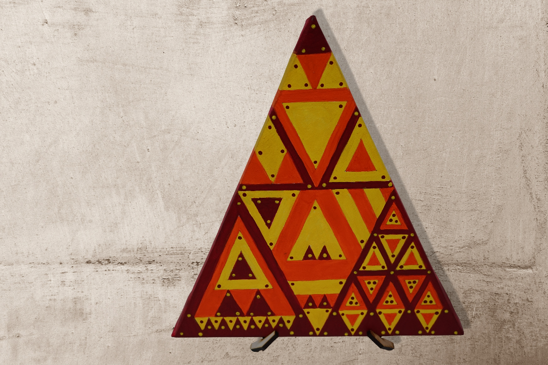 This isosceles acute triangular canvas pulses with energy through layers of nested geometric forms. Painted in warm hues of maroon, orange, and golden yellow, the repeating triangular motifs create a rhythm that suggests both harmony and ascent. The small dotted accents recall ancient patterns found in textiles and ritual objects, lending the work a symbolic, almost ceremonial quality. The Summer Wind invites the viewer to contemplate balance, growth, and the timeless power of geometry as a language of art and spirit.