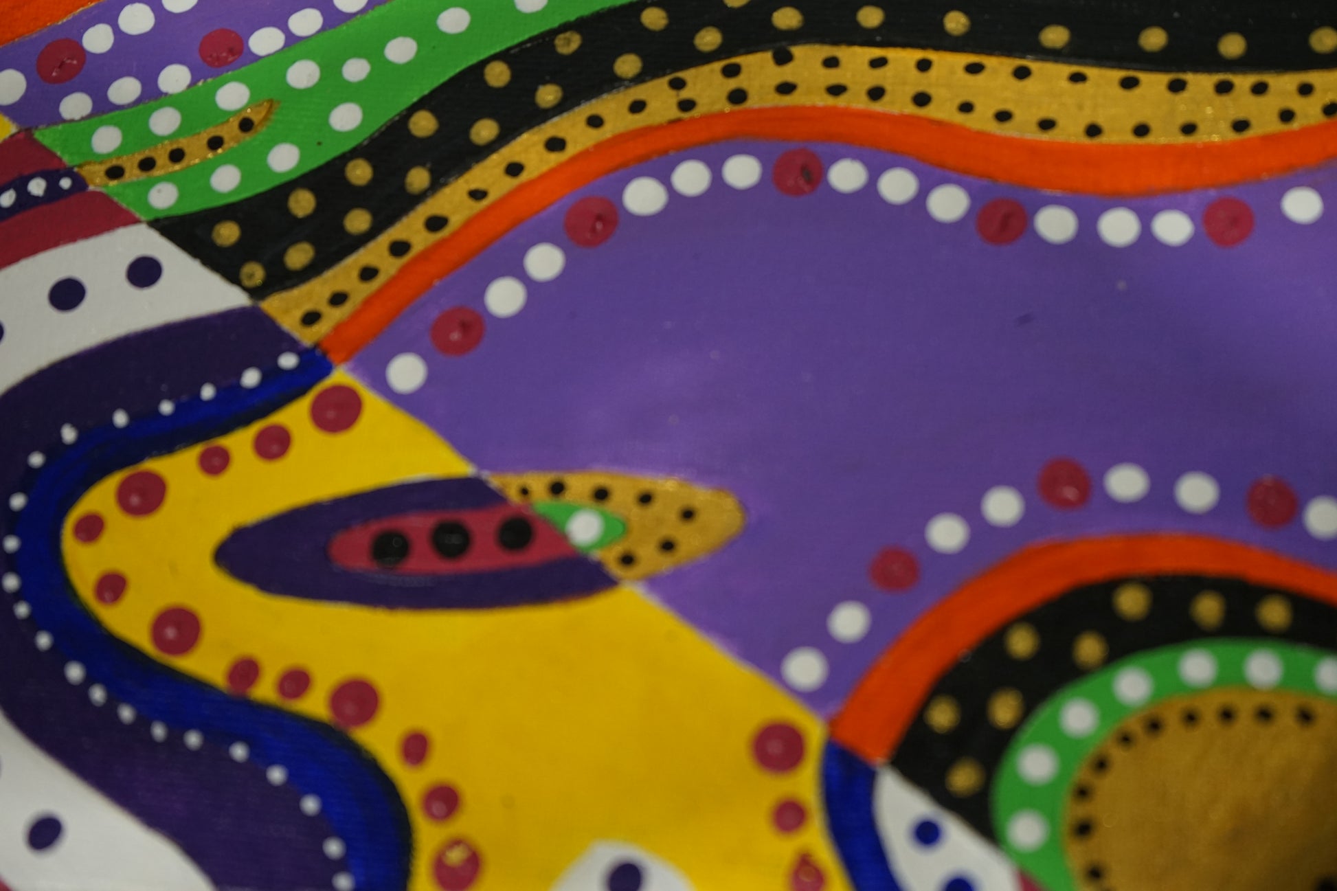 Bring some excitement into your space with this bright and vividly colored obtuse scalene triangle artwork. The swirling pattern of organic shapes mimics Indigenous Australian dot painting styles, and is divided into winding amoeba-like sections, each painted in bold tones.